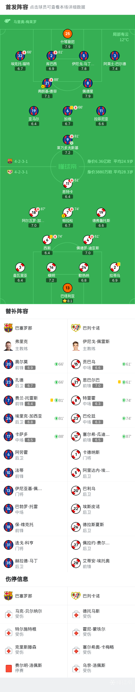 在下半场的比赛中,双方都派出了一些替补球员进行轮换,试图在体能上取得一定的优势。但无论是巴塞罗那还是巴列卡诺,都没有放松对胜利的追求,全力以赴地展开比赛。场上的比分一直维持在1-0,这使得比赛更加扑朔迷离,双方都在寻求扩大领先或追平比分的机会。